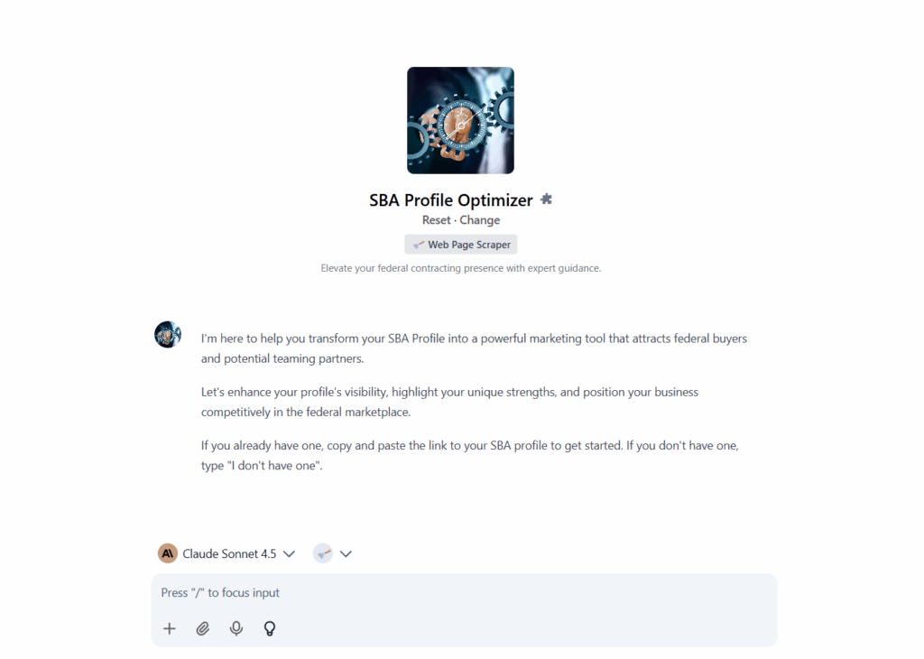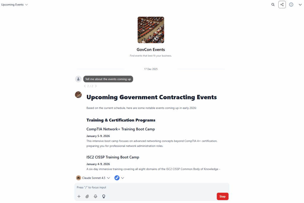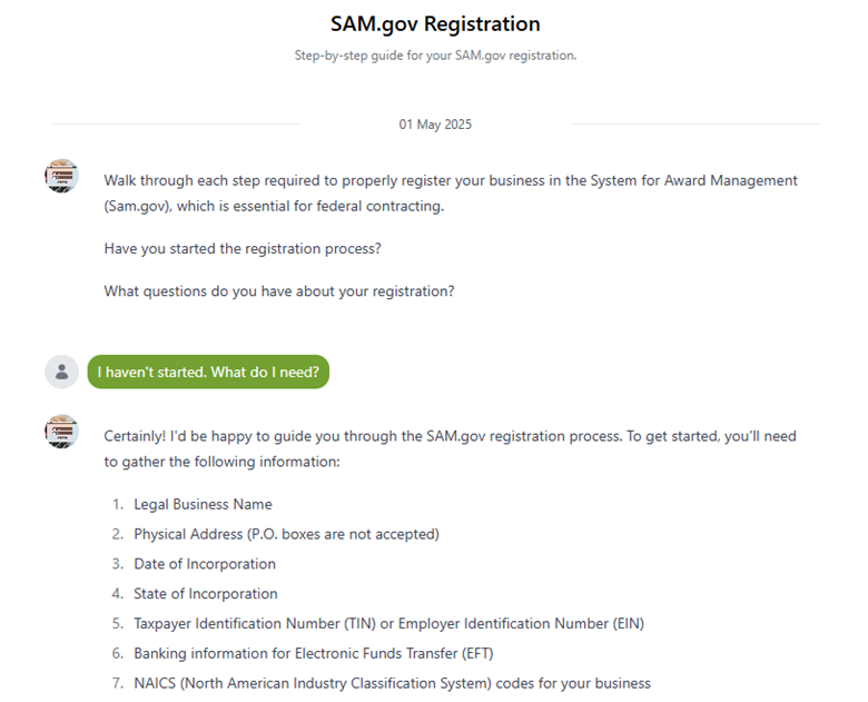 OpnGovIQ’s GovCon Coach is available 24/7 to answer your government contracting questions, provide expert guidance, and deliver accurate information instantly so you can make decisions and keep learning without delay.